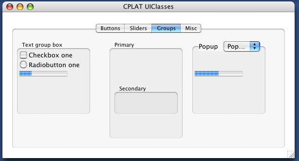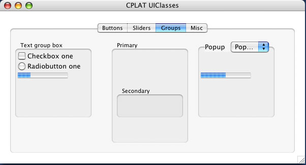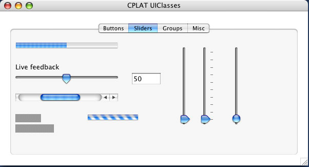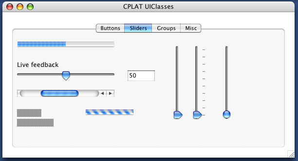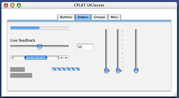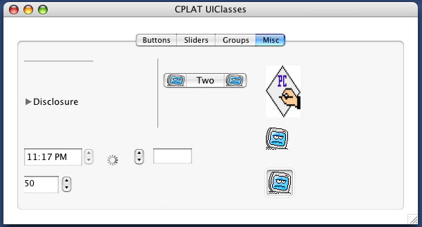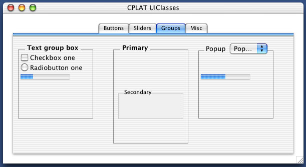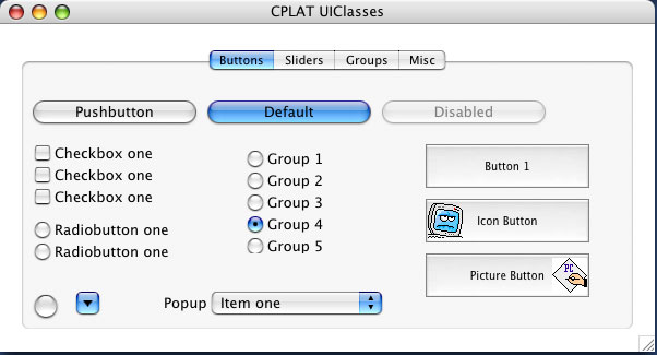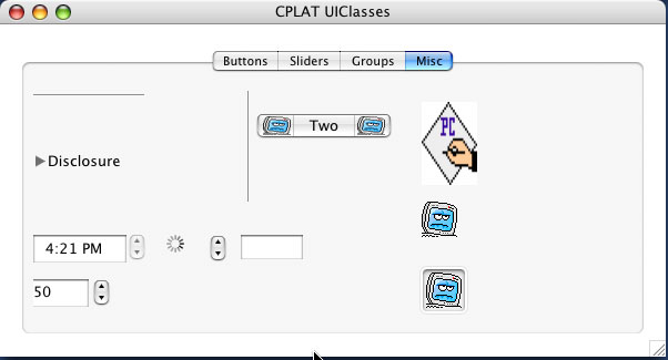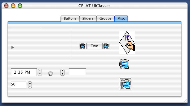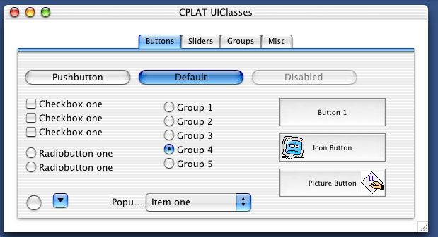 The following are some example screen shots of of the CPLAT_Mac UIClasses demo, under OSX 10.4, OSX 10.3, and OSX 10.2.